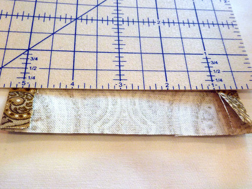 - Wrap the raw edge of the fabric over the hemmer, aligning the raw edge of the fabric with the appropriate ruler mark for your initial fold. We used a ½” initial fold. Press in place.