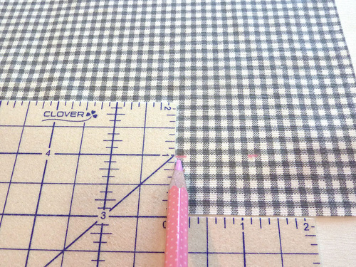 - Using the corner cut out, position the bottom edge of the Hot Hemmer so it runs along the bottom raw edge of your fabric. Slide the Hot Hemmer right to left, marking at your desired height. We show a 1″ mark in the photo below. Just keep the edge of the Hot Hemmer running flush with the raw edge of the fabric.