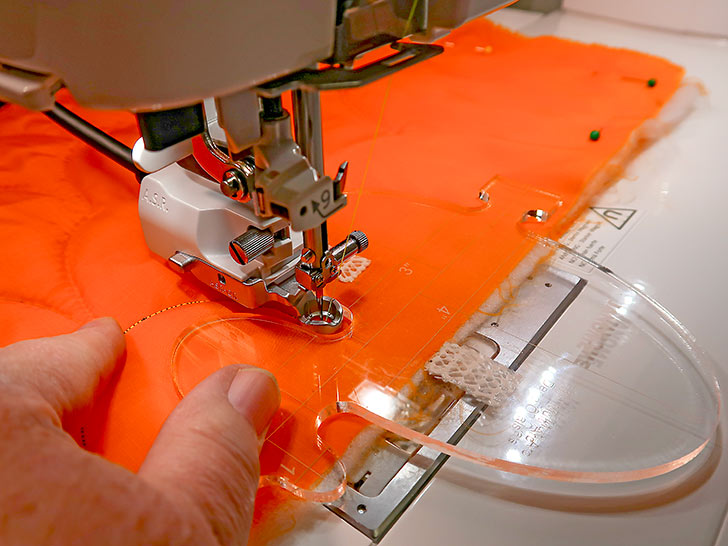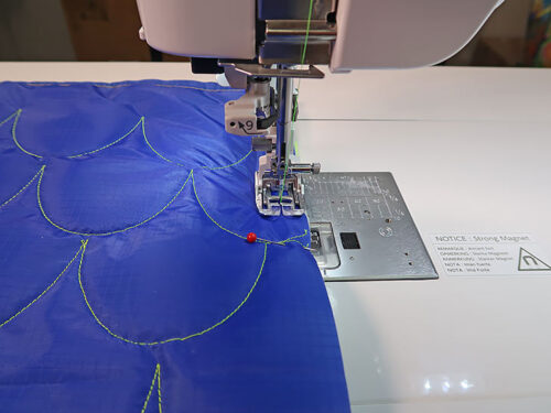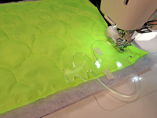- Set up your machine for free motion quilting/ruler work. As mentioned above, we used the Janome M8, the A.S.R.™ Accurate Stitch Regulator with the ruler work foot, and the Janome Sew Comfortable Edge to Edge Template Set for our front panel embellishment. We took advantage of the clamshell template to stitch five rows of perfect 3” scallops across the bag’s front panel.