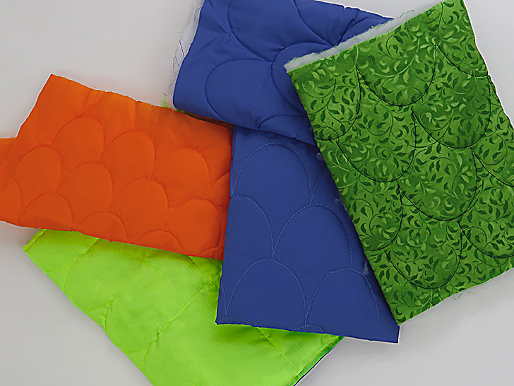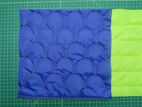 - All the cutting details are listed above, but we strongly encourage you to use the extra fabric and batting to cut one or two test panels, layering the two ripstop colors with the batting in between. This will allow you to confirm all your settings and practice your ruler work. In the photo below, you can see we are using a different color of ripstop to do some initial testing prior to switching to our chosen fabric. This is a good option if you happen to have some ripstop in your stash. If not, simply use the extra main fabric.