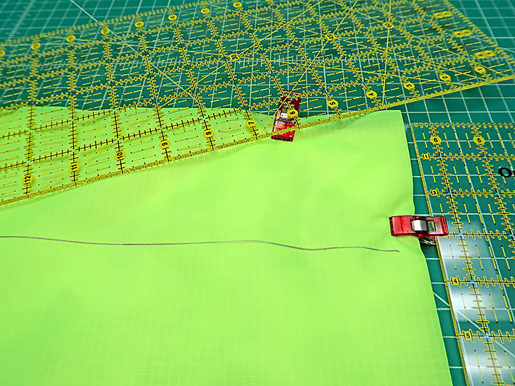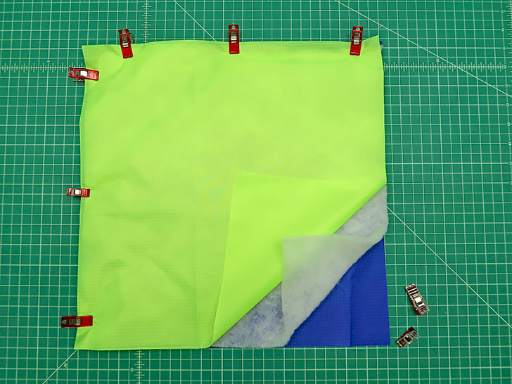 NOTE: One of the nice things about ripstop is there isn’t a right side or wrong side – both are the same. If using another type of substrate without this benefit, your exterior and lining layers should be wrong sides together with the batting between. - Clip the layers together. Make sure both layers of ripstop are nice and smooth.