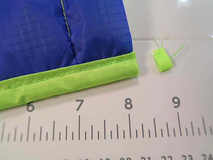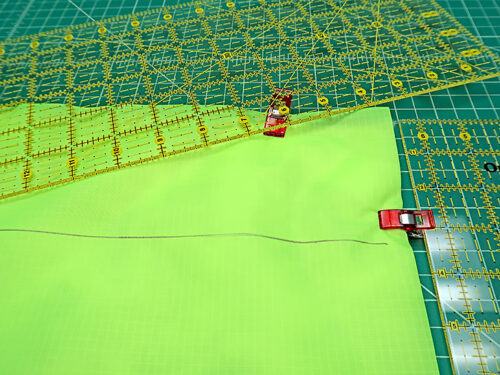 TWO 1½” x 12½” strips for the top ties - From the fabric for the interior seam binding (the fluorescent green ripstop in our sample), cut the following: