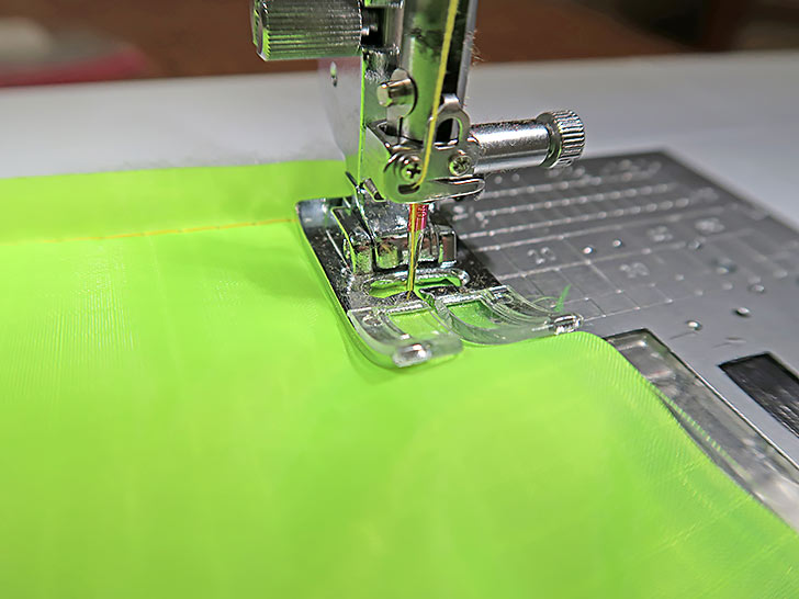 - We kept our 40wt polyester embroidery thread in the bright green in both the top and bobbin. Our stitch length was set to 2.8mm.