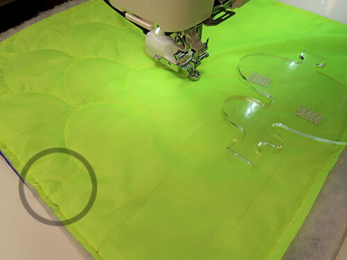 - For the best look, the rows of clamshells should be offset, like subway tiles. In the photo below, we’ve moved the template out of the way to show how the rows are offset and centered. You can also see how we’ve stitched “into” the row from the raw edge in order to make sure there will be continuous stitching all around when we cut the panel to its final size.