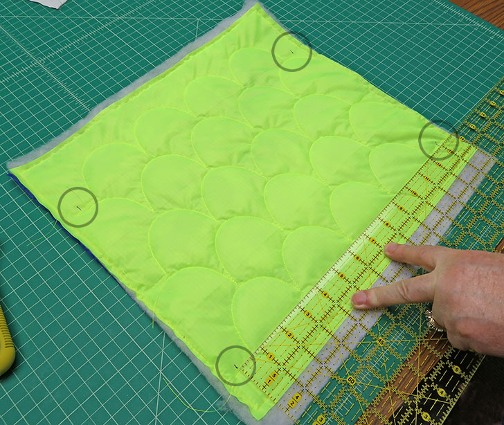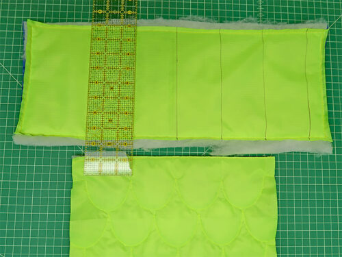 - On the base panel, the quilting lines run vertically. First find the exact center of your base panel and align this center point with the center of the bottom row of scallops on the front panel. Draw in this first center vertical line, and then draw additional parallel lines at 3” intervals to the left and right of center. You will have five main lines, but might have one or two more near the edges; this is fine as they will be trimmed away.