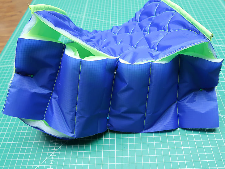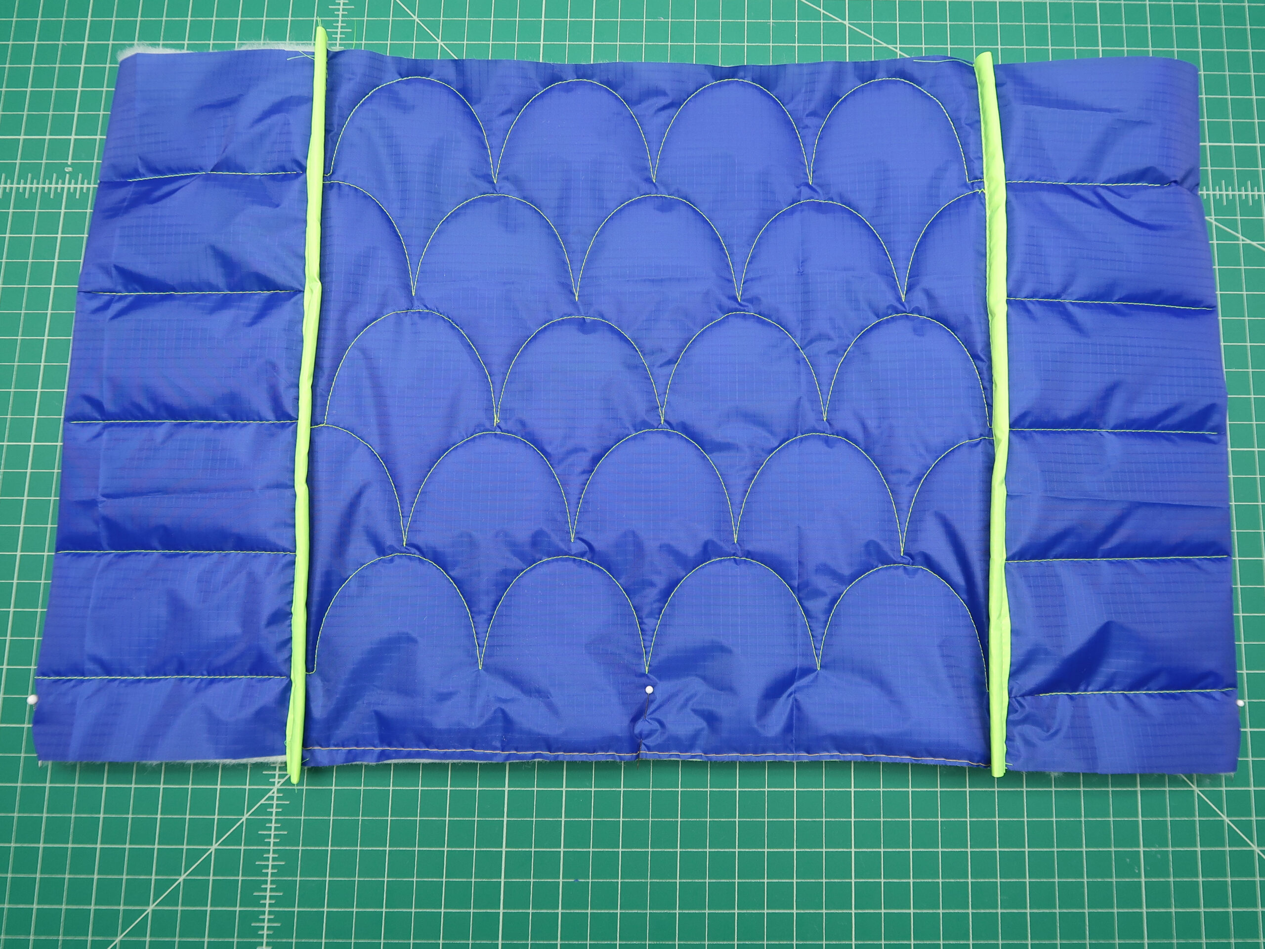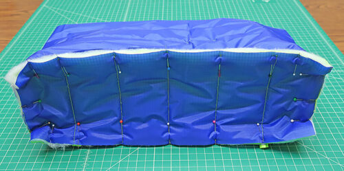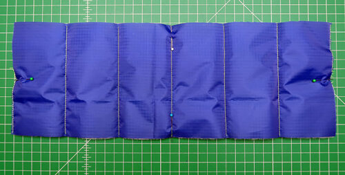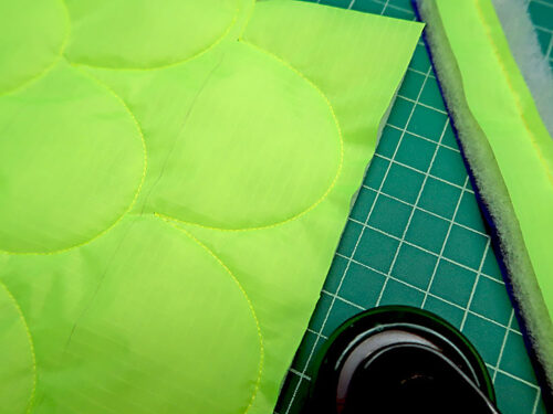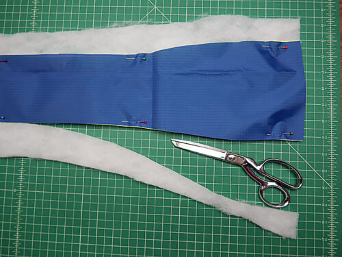 - Layer the trimmed ripstop straps on top of the batting blank. Pin in place and use the trimmed ripstop as your pattern to trim the batting flush.