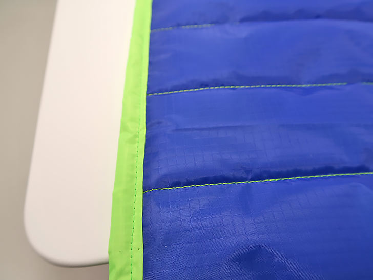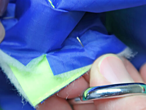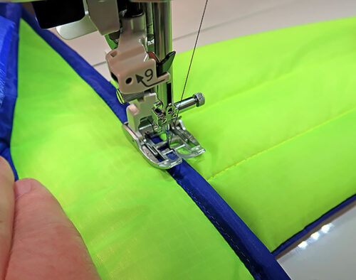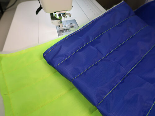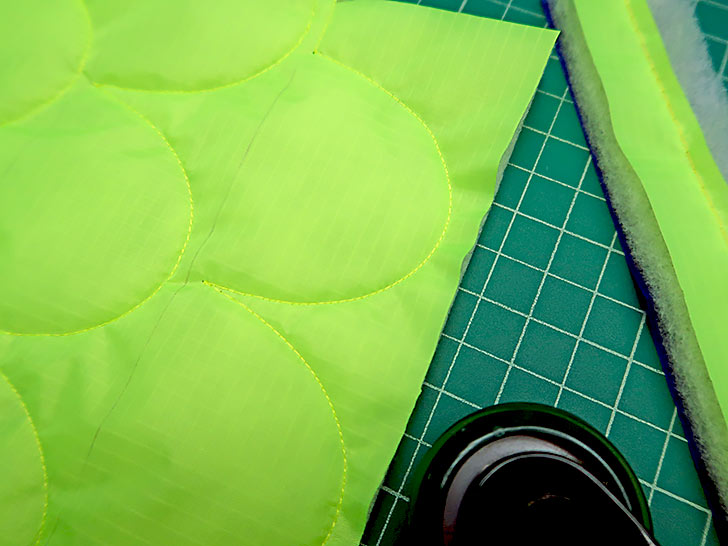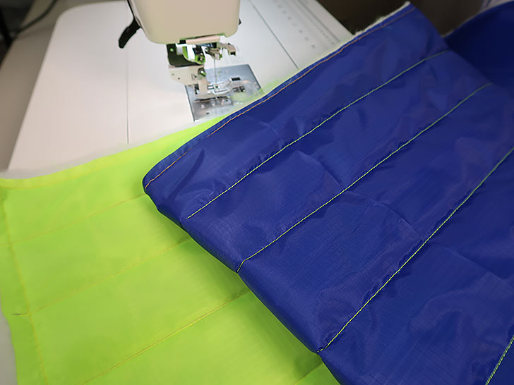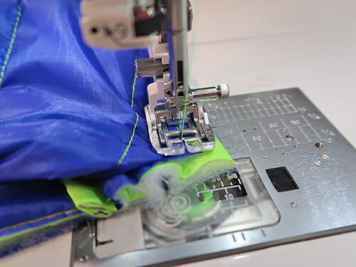 NOTE: Our ripstop combo features two very different yet very compatible colors: one dark and one light. We tested several threading options, landing on the same color top and bobbin for two reasons: 1) it insures there is zero chance of a speck of darker bobbin thread showing up, because even with the best machine and the best operator, a slight bobble or an unintentional stop in your free motion quilting can cause a bit of bobbin thread to show on the top. That is why free motion quilting experts nearly always recommend using the same color thread in the top and bobbin – and it is the main reason we suggest it here. 2) The bright fluorescent green thread against the royal blue lining creates some beautiful “stitch art” on the inside of the bag!