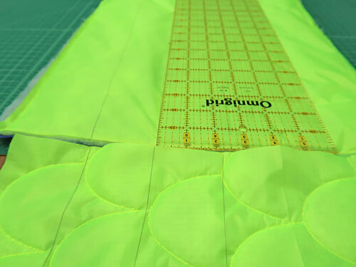 NOTE: Our scallop ruler work template was designed for 3” scallops, which is why the base panel interval given above is 3”. However, it is best to actually align your ruler with the true width of the scallops as you move across the base panel. Our “true” width was 2⅞” because there is always some shrinkage that happens with any kind of quilting. So – again – use the scallops themselves on the front panel as the true guide for your vertical base panel lines.