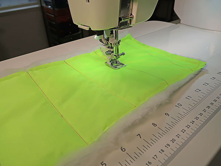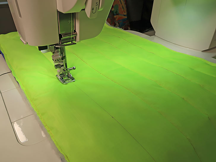- Following your drawn guide lines, add the straight line quilting to the body panel. Start with the panel’s center line…