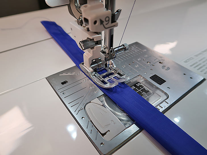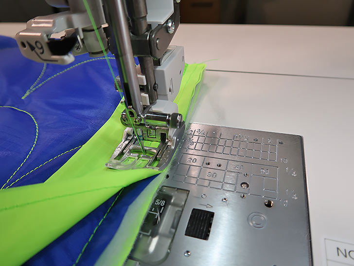 - Re-thread the machine with 40wt polyester embroidery thread in the top and bobbin. As above, use thread to match the exterior in the top and bobbin. We are continuing to use the AcuFeed™ Flex built-in fabric feeding system, straight stitch needle plate, and a 2.8mm stitch length.