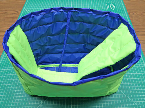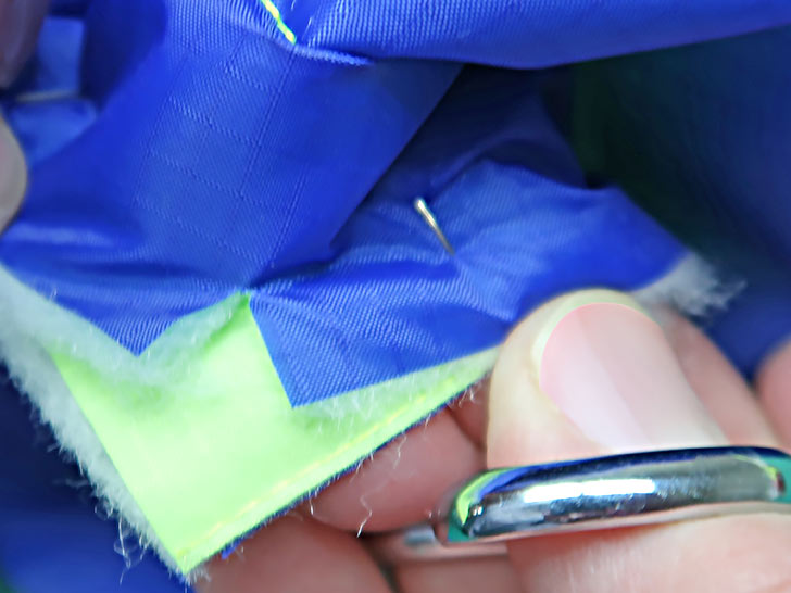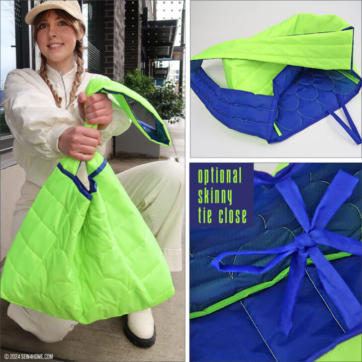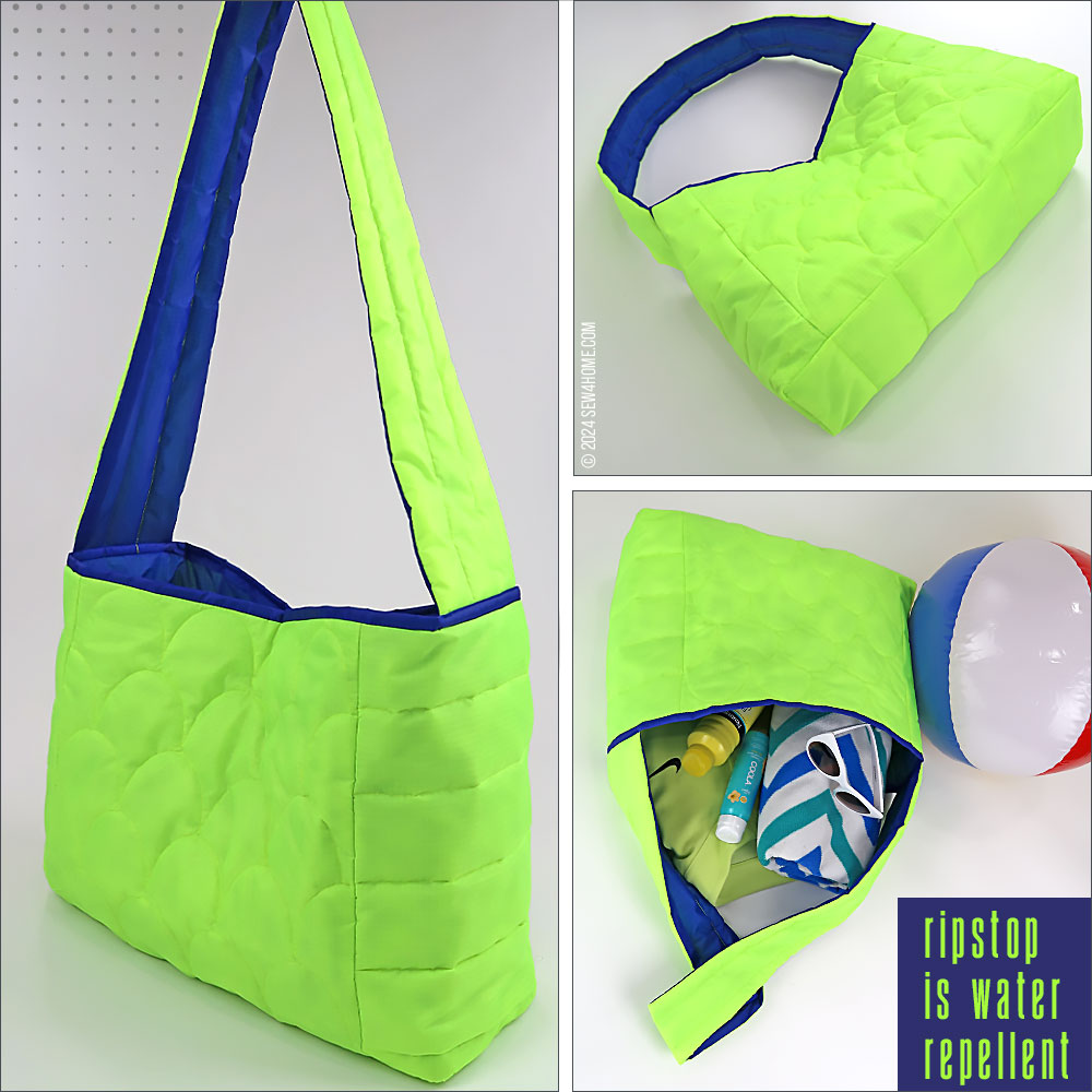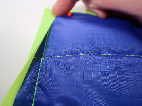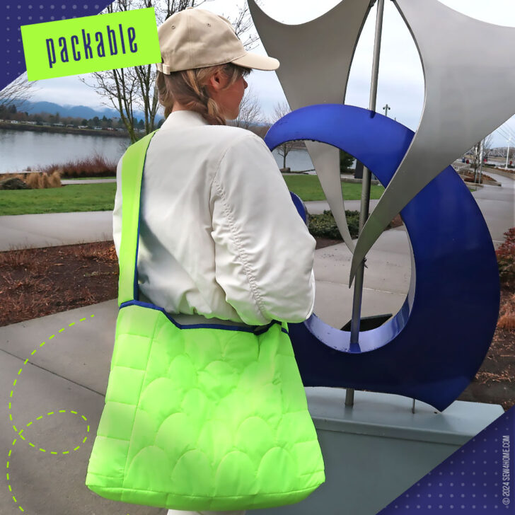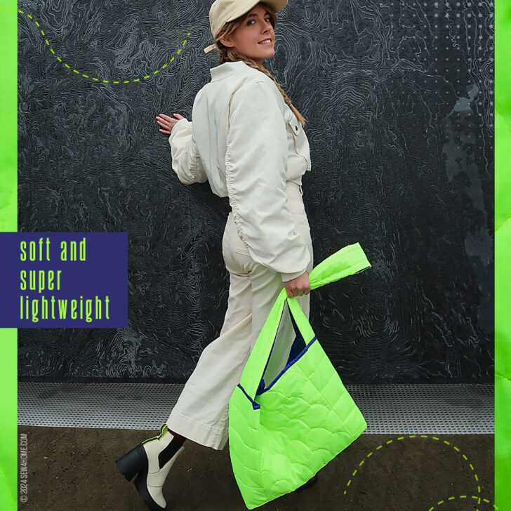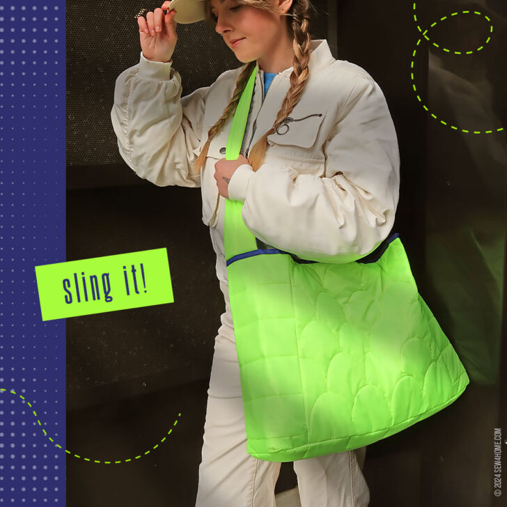 We turned to ripstop as our fabric choice for two reasons: 1) it’s the same type of nylon fabric used on classic puffer coats, and 2) it comes in a wide array of fantastic colors, like the eye-popping combo we used. The bag itself and the shoulder strap feature both colors. Then, the royal blue of the lining becomes the upper binding, and the fluorescent green exterior fabric is used to bind the visible interior seam allowances, which are created because of our easy, layered construction method.