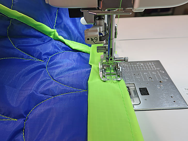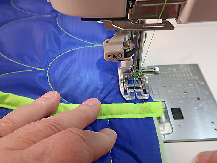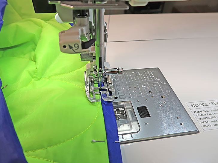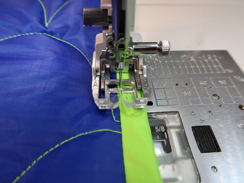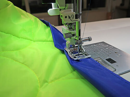 - Using a ¼” seam allowance, stitch the binding in place. As you can see in the photo below, we again chose to not use pins. As mentioned before, the AcuFeed™ Flex system does a beautiful job of holding the layers in place, but pins are definitely an option should you wish.