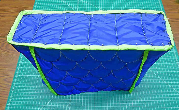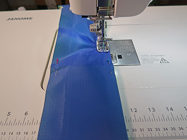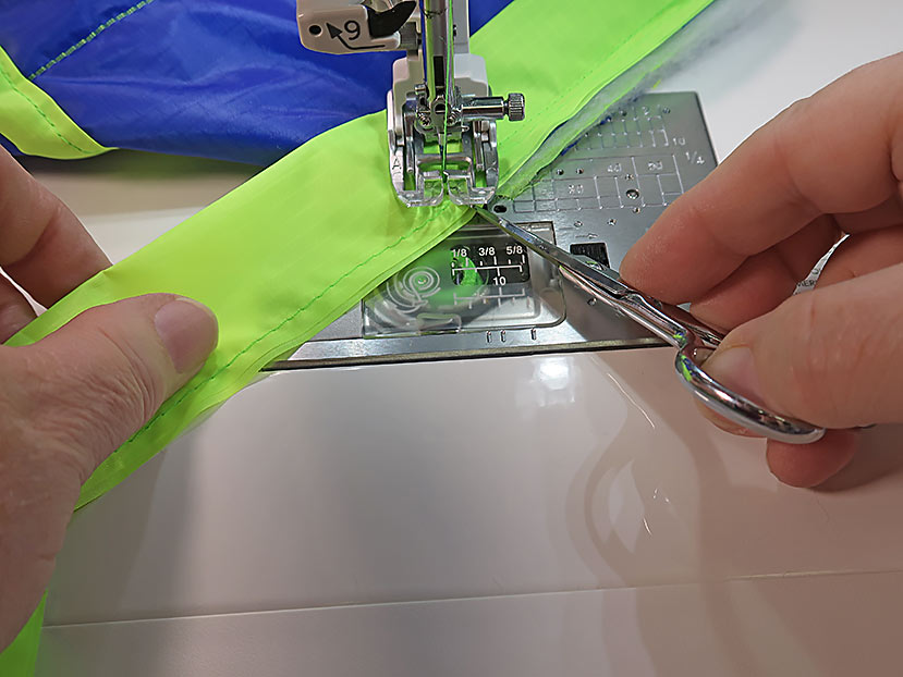 NOTE: We didn’t baste the tie ends, but you certainly could. It’s okay to do the basting with the blue thread currently threaded in the machine. It will be hidden within the binding. If any peeks out, it can be removed later. - Find the 2½” x 45” binding strip (in the royal blue ripstop for our sample).