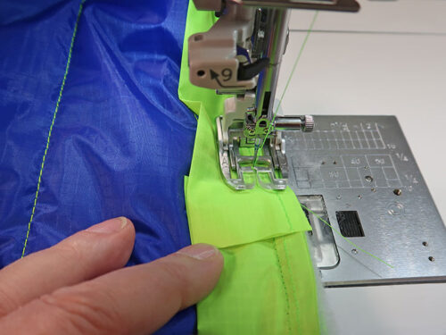 - Align the basted raw edges of the binding strip with the raw edges of the seam allowance – just the seam allowance; you are not stitching onto the body of the bag. Because of the security of the AcuFeed™ Flex feeding system, we did not use pins or clips to hold our binding strip in place against the seam allowance. We simply held it with our fingers and stitched at a slow and even pace. You could certainly choose to pin the binding in place.