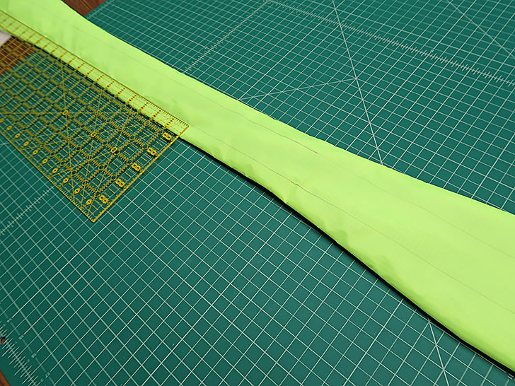 NOTE: Our ripstop fabric arrived in a small bag and so had some stubborn fold lines. Because of this, after cutting our blanks, we did choose to press all the blanks to get them as flat and smooth as possible. This MUST be done with your iron on a lower setting and with a pressing cloth! No exceptions unless you want your pretty ripstop – and likely your iron – to be ruined with melted nylon. This was the only point in the construction that we used an iron. - The strap layering and final cutting from the pattern will be done towards the end of the project steps below. In preparation, cut from BOTH ripstop colors AND the high loft batting ONE 8” x 42” blank.