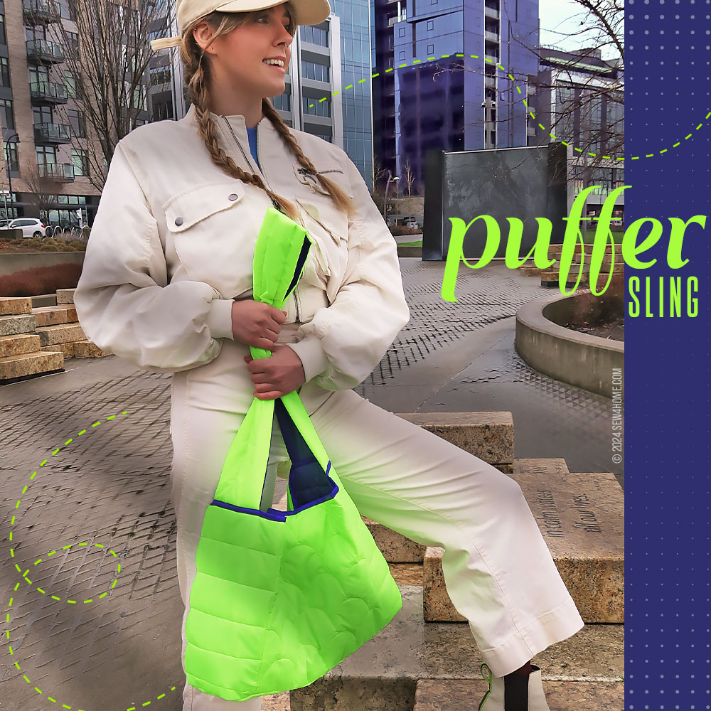 The puffer bags we saw at retailers from Coach to Anthropologie all had a very sporty, casual vibe; our DIY version is designed in the same mode. And, our on-the-go model makes a stunning statement with the bag’s bright colors and easy-going style. We do always love to ask our models for their opinions on the projects, and the Puffer Sling Bag got Five Stars. “It’s really soft to hug right up against my body, and I love how lightweight it is. Can I keep it?”