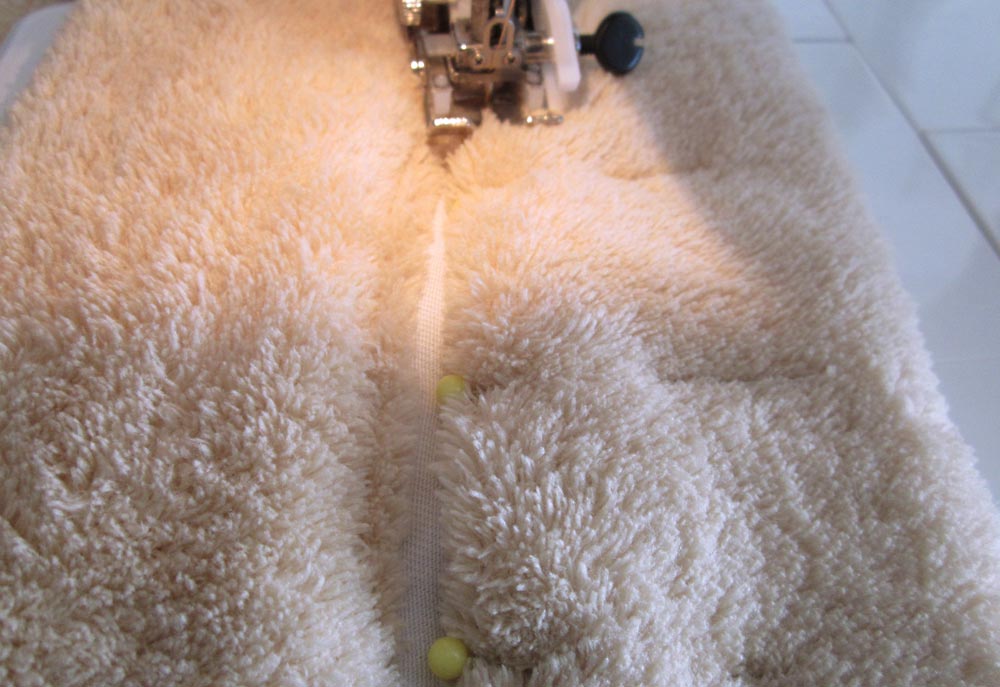 - Start at one end and edgestitch one side in place. Remove the pins as you go.