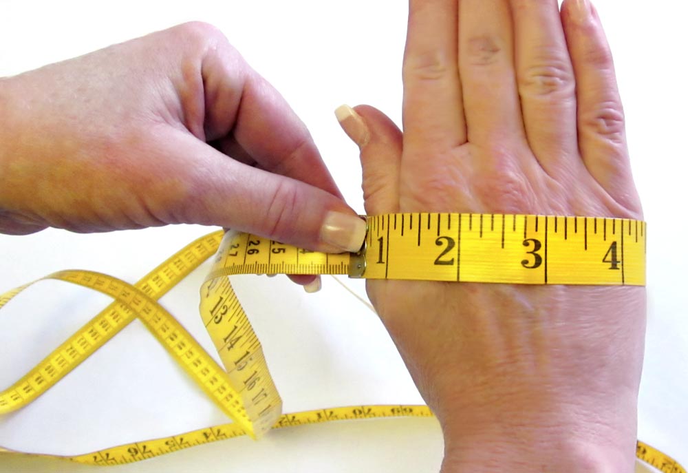 - Hold your hand thumb in, as if signaling someone to “stop!” and measure around the widest point across the palm and around your thumb.