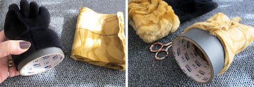 NOTE: Other types of tape rolls would work well, as would the sliced-off end of a shipping tube or even a really wide bangle bracelet. - Stretch the glove down over one side of the round object. The glove is right side out. Then slip the cuff up over the opposite side so the cuff of the glove and the raw edge of the faux fur cuff butt together. The cuff is wrong side out. Do not overlap the two; they should butt edge to edge.