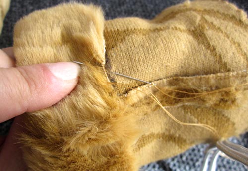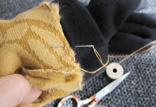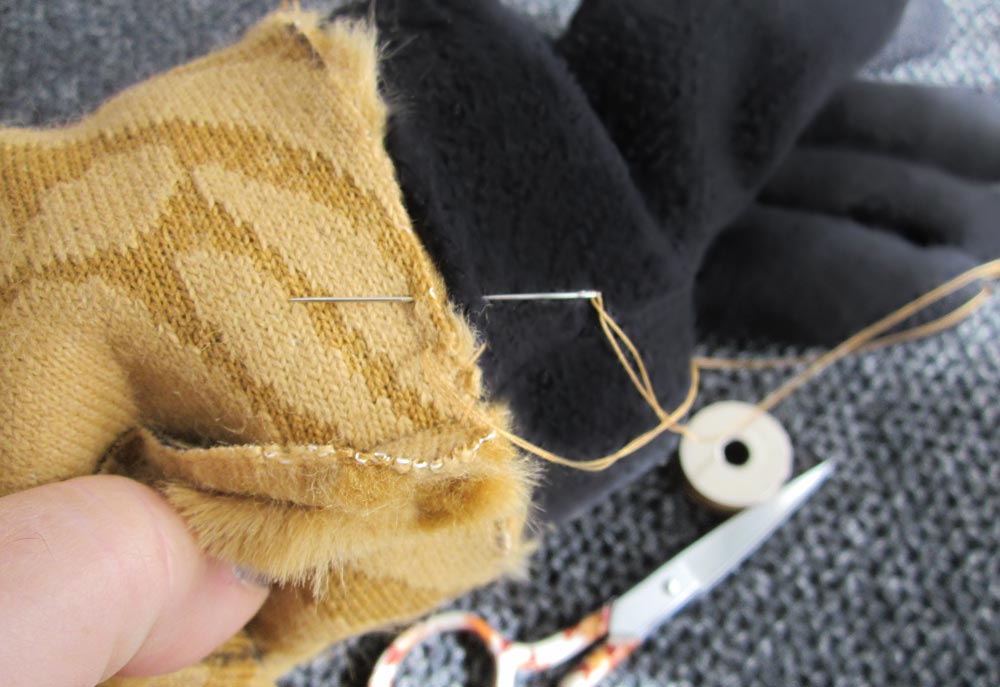 - Thread a hand sewing needle with thread to match the faux fur and whip stitch the glove to the cuff.