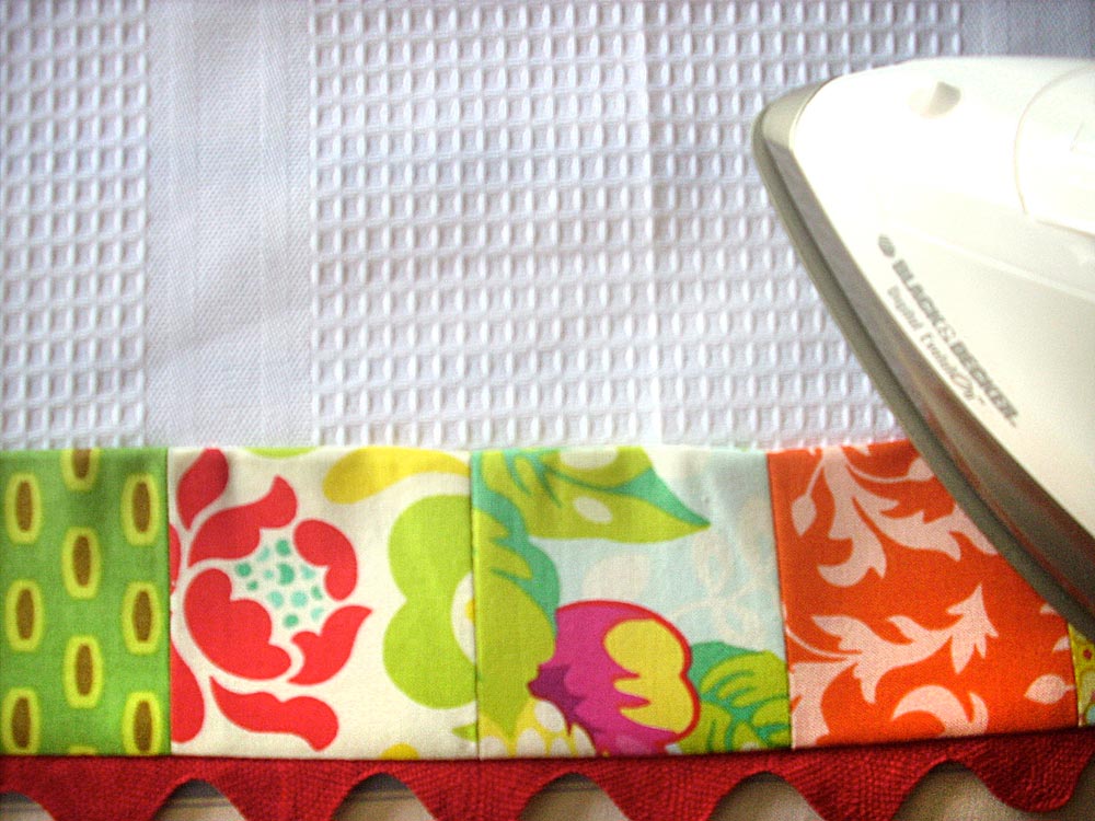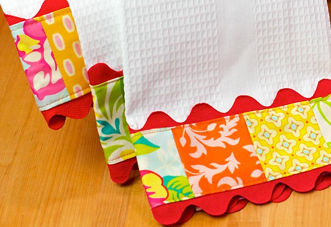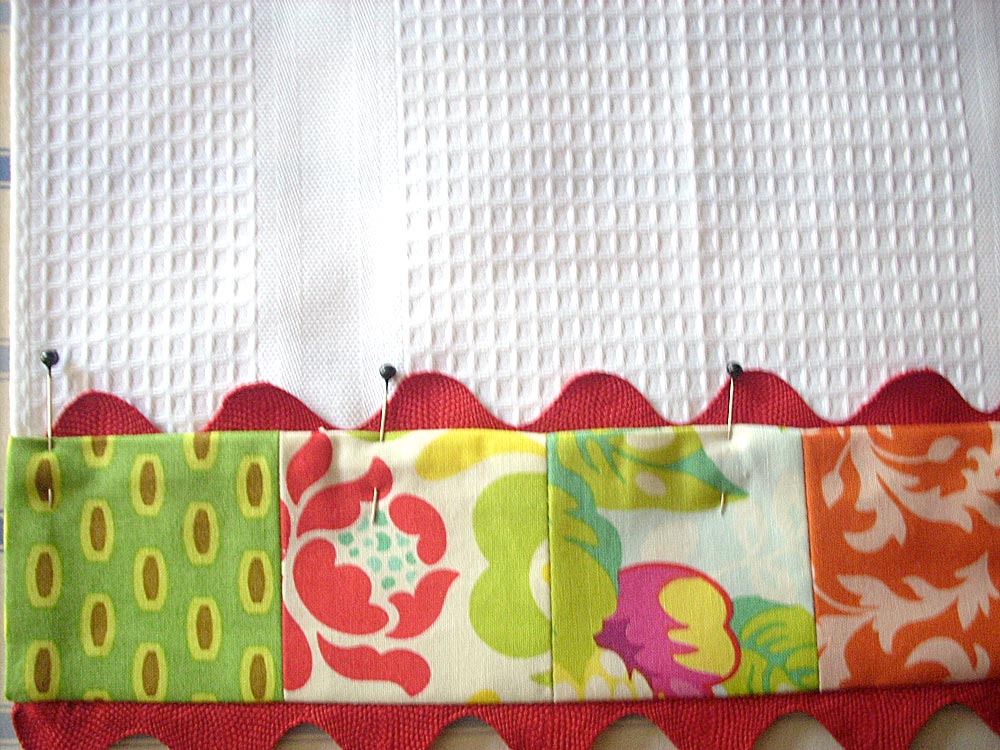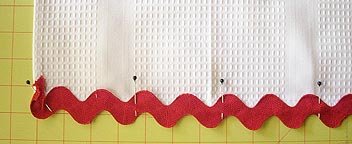 - Take one rick rack strip and pin it along the bottom edge of one towel. Center the rick rack right along the edge, so the “waves” extend equally above and below the bottom of the towel. Turn the edges of the rick rack up and in. These edges will eventually be covered by your patchwork trim. Pin in place.