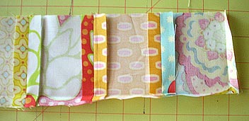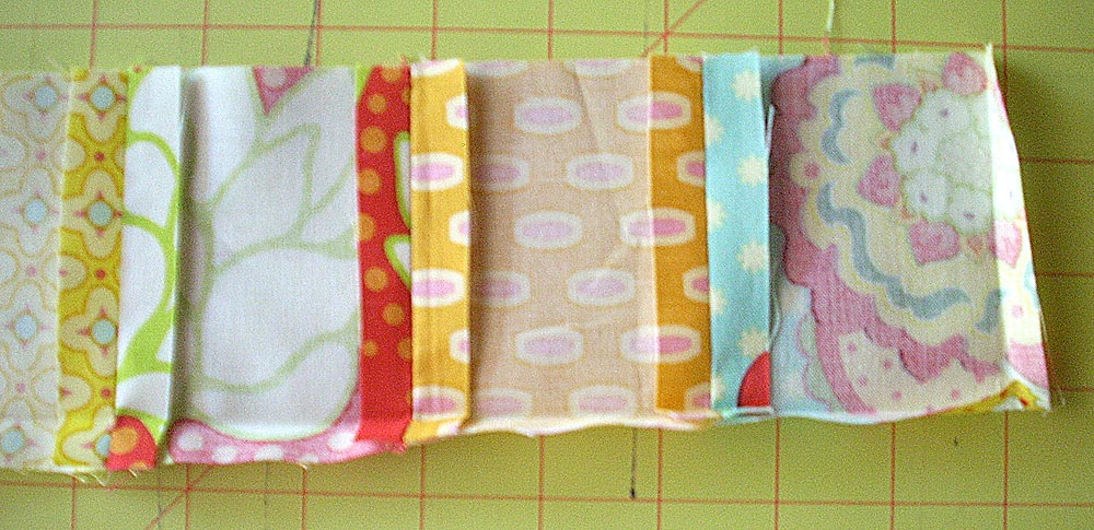 - Prior to cutting, mix and match your fabric scraps on a large flat surface until you have two sets of eight squares that look good in a row.