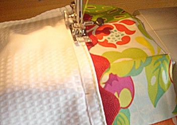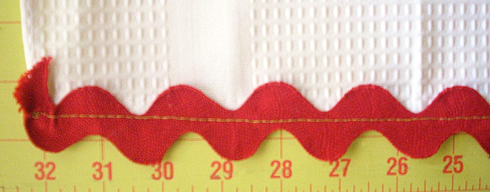 - Move to your sewing machine and flip over. Stitch in place, following right along the seam line that secured your rick rack to the towel (step 8 above).