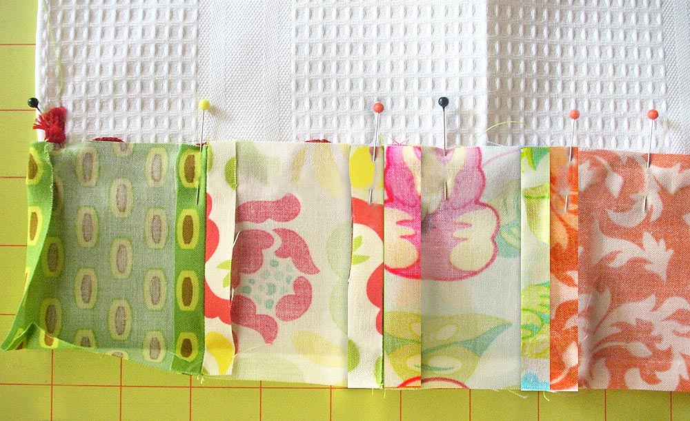 - Collect the set of eight squares you want for your first towel border. Pin the first two squares, right sides together, along one side.