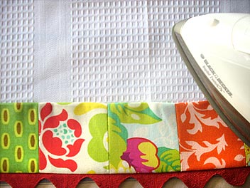 - Take a completed eight-square row and press under one long side and both short sides ½”. Be careful to keep your edges and corners nice and sharp. Your row now measures 20″ x 3″.