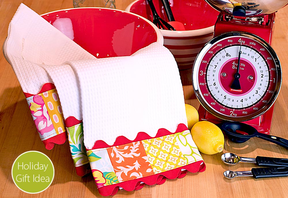 Pull out your box of scraps, add some colorful trim, and you can transform a plain set of off-the-shelf kitchen towels into a great gift. Our cute tea towels are trimmed with a simple eight-square patchworked row and highlighted with bright red jumbo rick rack. They’ll be fightin’ over who gets to dry the dishes! Or… are you looking for green gift wrap ideas? Make a few of these adorable towels, then use them to wrap up a selection of kitchen gadgets to give a gift inside a gift.