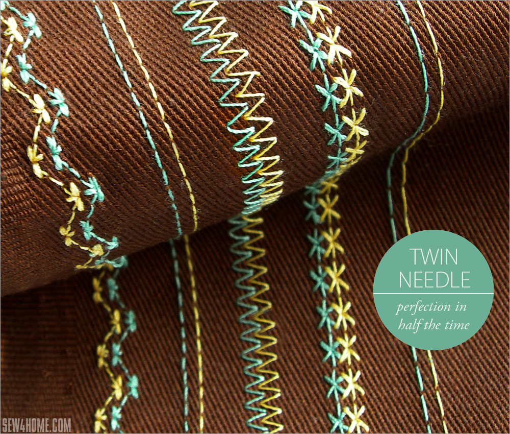A simple straight stitch with a twin needle always looks crisp and exact. It’s the one we use most in home décor sewing. However, your machine may be able to sew a zigzag or decorative stitches with a twin needle, which can be very pretty, especially with two different colors of thread.