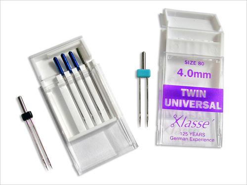 Twin needles come in a variety of sizes just like regular needles. But they have two number designations: one is the space between the needles and the other is the needle size. For instance, a 4/80 twin needle has 4 mm space between two size 80 needles. The picture below shows a Janome needle pack on the left; many Janome models come standard with a twin needle. On the right is a Klassé twin needle. Several manufacturers offer twin needles; check to be sure it’s a proper fit for your machine.