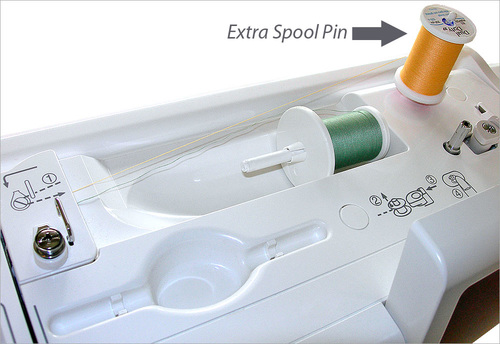 Most machines come with an extra spool pin and a hole to put it in. That’s where you put your second spool. Again, consult your owner’s manual to see what your extra spool pin looks like and exactly where it goes.