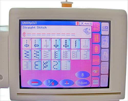 The image below shows you the back of straight as well as decorative stitch options. The larger flat surface is the back; the smaller flipped over section is the front.