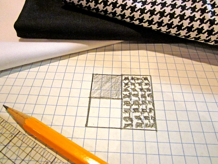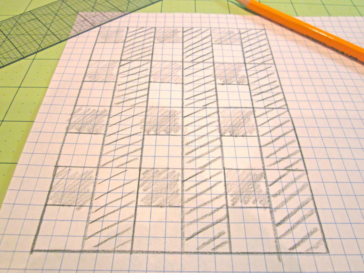 - If you want to know what your selected fabrics will look like, cut sample pieces and place them on your drawn design. The motif sizing might not be 100%, but it will give you a good idea of color and pattern mixing.
