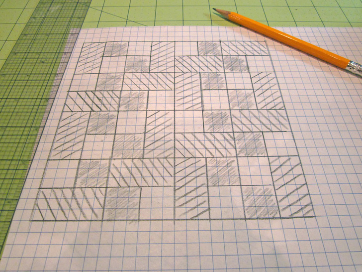 NOTE: In the following examples, we’re showing small renderings of how to draw the blocks in succession with borders and sashing. The lines represent the seams, but around the edge, they represent the raw edge. The shading and texture lines represent the three different fabrics with which we are working. Many quilters like to use colored pencils that coordinate with their selected fabrics to get an overall idea of what the finished quilt top will look like.