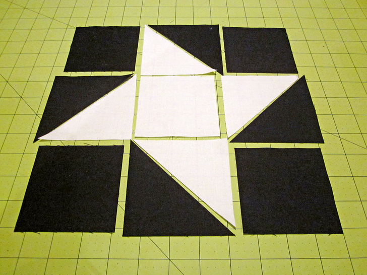 As we stated above, working with a quilt block pattern is certainly acceptable, and a good way to get started. Using the same basic square, rectangle and triangle shapes you learned to cut in Part 2, you can make a number of existing quilt blocks. The ones we have shown below are considered traditional options that are great for beginners.