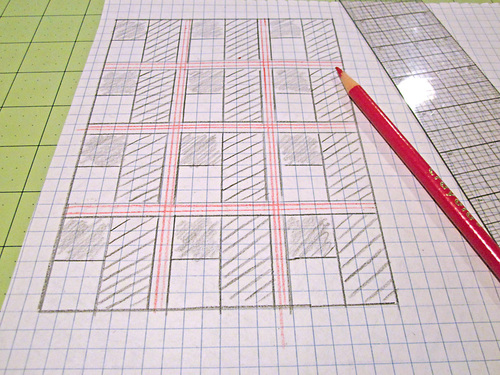 Now that you have an idea of the ways to quilt a quilt, you need to pick one. When starting out, we recommend trying stitching in the ditch or straight line quilting. A great way to determine which method to use is to sketch or draw your intended quilting pattern on paper first. You can draw an actual block or copy an overall picture of your quilt top, then draw on it to determine what looks best. Our quilting lines are sketched in red in the photo below. Many experienced quilters will tell you the best way to feel confident at the machine is to sketch your selected quilting pattern over and over again.