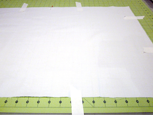 - Place the backing on the selected surface wrong side up. Make sure it is smooth with no folds or tucks. You do not want to quilt a tuck into the back of your quilt! Place tape perpendicular to the edges to hold this layer in place.
