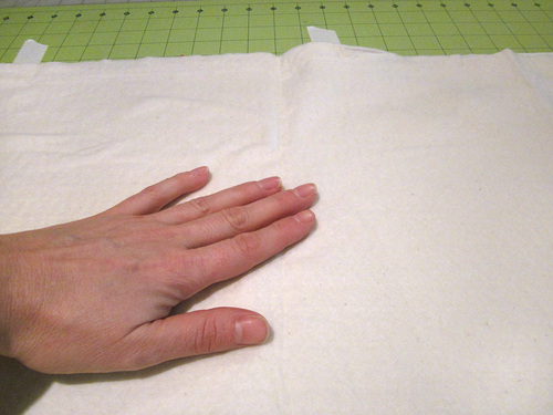 - Next, place the batting on top of the backing, matching the marked center points at the top and bottom. Use your hands to smooth the two layers.