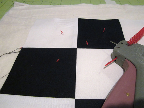 If you’ve ever had a job in retail, this quilt tool should look slightly familiar. It works exactly the same a tag gun for garments, only the plastic thingys are shorter. When you use a basting gun, the approach is the same as the previous two methods. You just have to be careful not to sew over any of the plastic thingys. The other downside is you do eventually have to go back and cut away all the tacks with scissors, making it easy to cut into your pretty quilt!