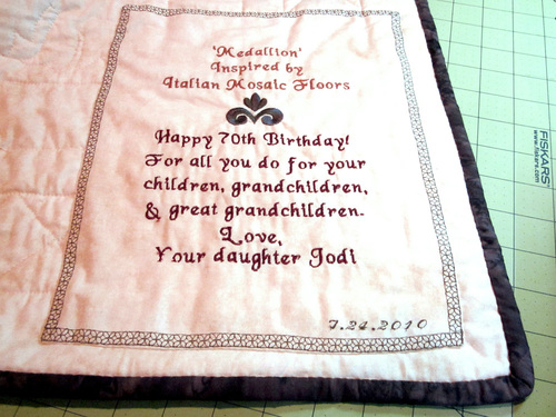 Most importantly, all quilters will tell you to label your quilt. Think of it like an artist signing her painting. Quilt labels can be simple – name, date, etc. Or, they can contain a special message to the receiver. They can be handwritten with special fabric pens or sewn with stitch lettering and/or embellished with machine embroidery and/or decorative stitching. Quilt labels are always sewn on by hand because you don’t want to stitch through your quilt top after all the work you’ve done. Below is an example of one of my own special quilt labels.