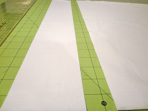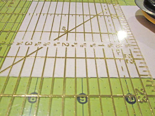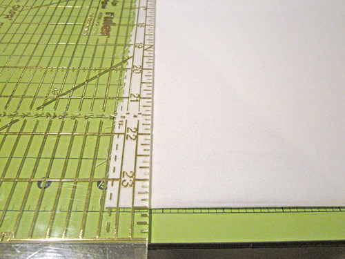 - Using the guide lines on the ruler, line up the edge of the ruler 3½” from the straight cut edge of the fabric.