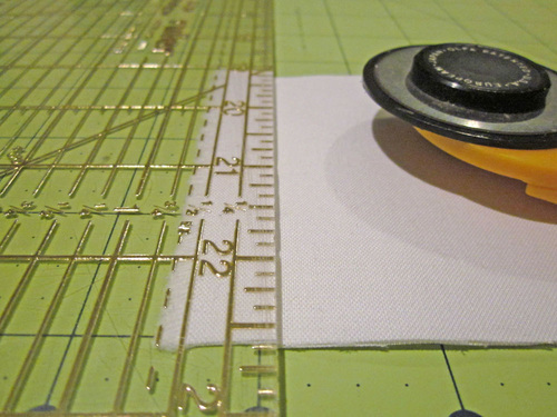 - Holding the rotary cutter firmly, pressing down (not too hard), roll the blade keeping it pressed against the ruler as you cut the fabric. Trim away just enough to create a clean edge.