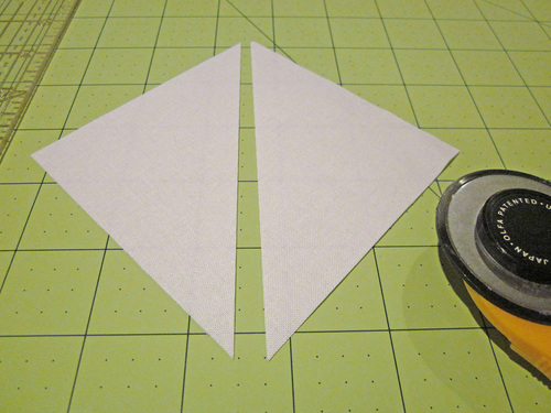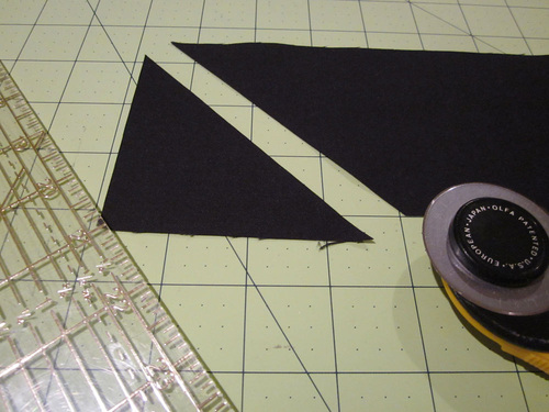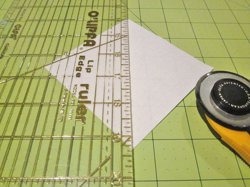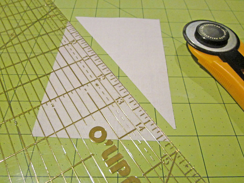 - It’s just as easy to cut triangles. You can start with the squares or rectangles you just cut above. However, one word of caution, the math to determine the triangle cut size is not as simple as for a square or rectangle. You can learn more about how to do this math in quilt books, and on the Internet – there are quick reference charts available too! We’ve provided a quick math equation below for determining the cut size in relation to the finished size of each of our examples.