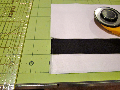 - For the second cut, we align the cut edge with the appropriate width measurement for our strip. In our example, the meant aligning the 3½” mark along the cut edge.