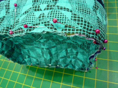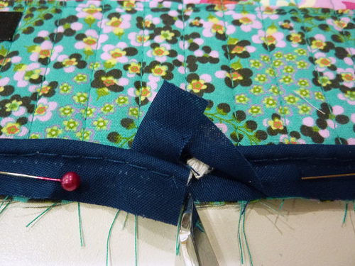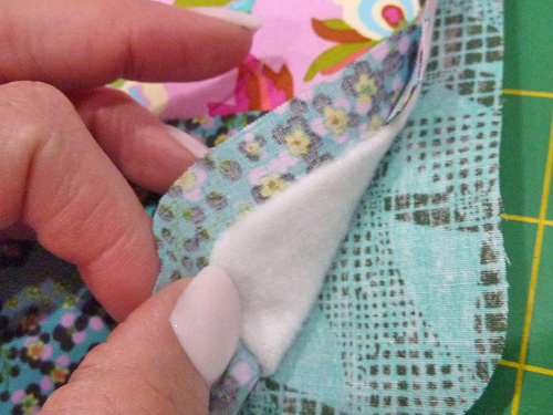 - Slip the binding to over the seam allowance. Remember, you are only wrapping and stitching to the seam allowance – NOT on the bag itself. Pin in place.