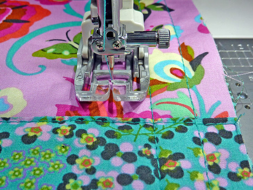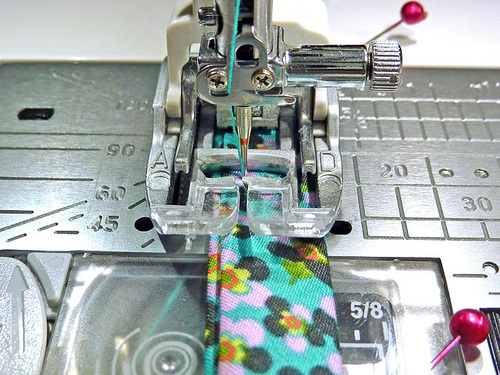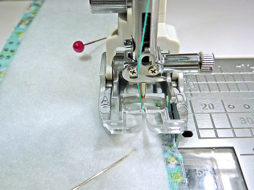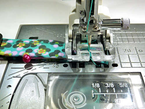 - Stitch across through the binding and the seam allowance. Go slowly and carefully to insure you are catching both sides of the binding in this one seam. We switched to our AcuFeed Zipper foot for more control.