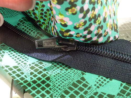 - As with all zipper insertions, when you feel you are approaching the zipper pull, stop with your needle in the down position. Raise the presser foot and twist the layers slightly so you can access the pulls. Then move the pulls out of the way of the presser foot. Once clear, drop the presser foot, re-position the layers, and finish the seam. This is particularly important with this type of zipper because there are two pulls to move out of the way.