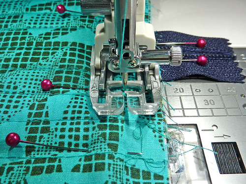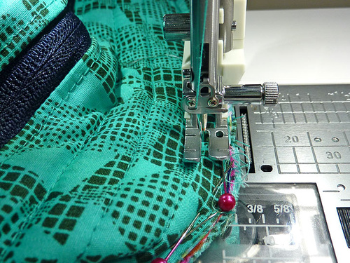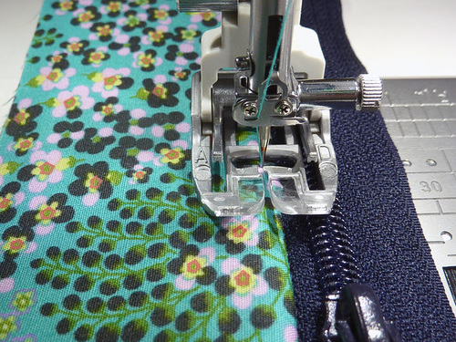 - The machine should still be threaded with thread to best match the exterior in the top and to best match the lining in the bobbin. Re-set the stitch length to normal. Attach a Zipper foot.
